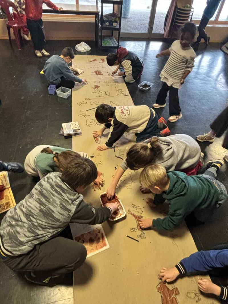Dès le premier jour, retour plusieurs milliards d’années en arrière ! Transformés en Homo sapiens le temps d’une matinée, les enfants ont appris à communiquer comme de véritables Cro-Magnon — entre “Grrr”, “Houba” et “Mammouth !” — tout en découvrant la fabrication d’outils et les techniques de survie.