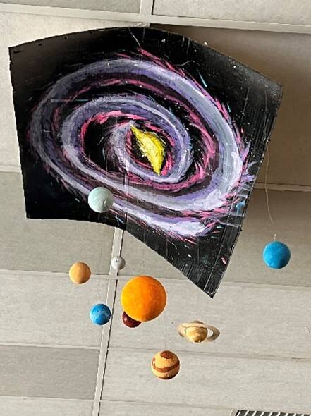 La première semaine était dédiée à Pâques ,nous avons réalisé une fresque de Pâques et des drôles de poules ; le thème de la deuxième semaine était le système solaire: projet mosaïques , réalisation d'un mobile du système solaire , animation astronomie .....